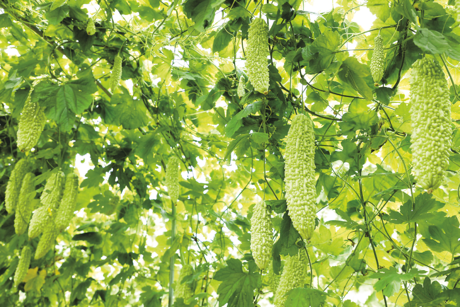 在興寧區(qū)五塘鎮(zhèn),一根根顏色翠綠、個(gè)頭飽滿的“五塘苦瓜”掛滿枝頭。(侯呈志 攝)