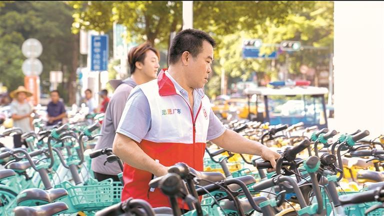 志愿者將共享單車(chē)擺放到指定區(qū)域。