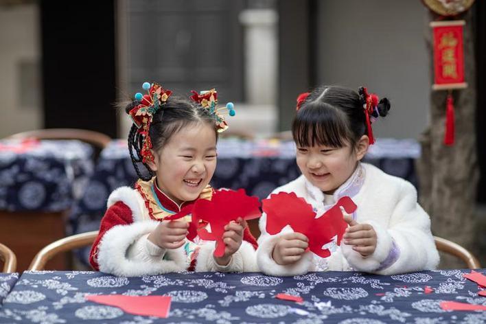 2月2日,在江蘇省興化市昭陽街道的畢飛宇工作室內(nèi),興化市昭陽湖幼兒園的孩子們?cè)诶蠋煹闹笇?dǎo)下創(chuàng)作以生肖馬為主題的剪紙。