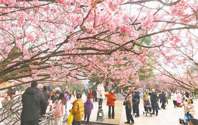 2月20日,重慶園博園,游客徜徉于櫻花樹下打卡拍照。特約攝影 鐘志兵/視覺重慶