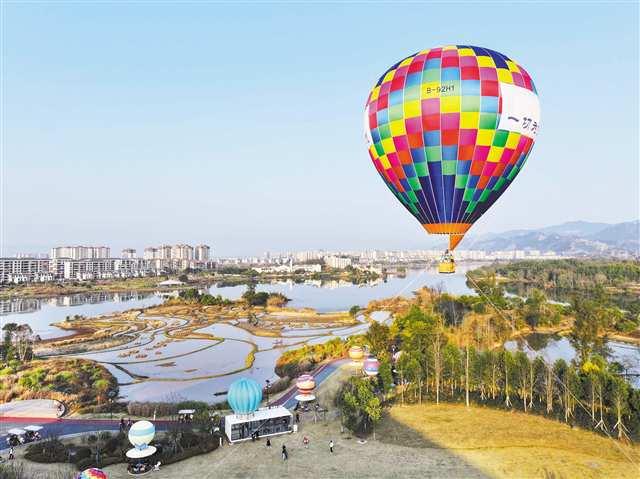 2月20日,梁平區(qū)雙桂湖國(guó)家濕地公園,游客乘坐熱氣球俯瞰美景(無人機(jī)照片)。特約攝影 劉輝/視覺重慶