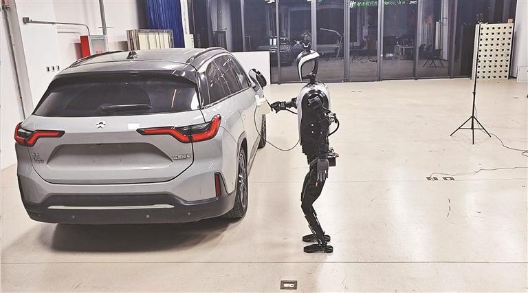 樂聚夸父人形機器人在測試場景中為車輛充電。
