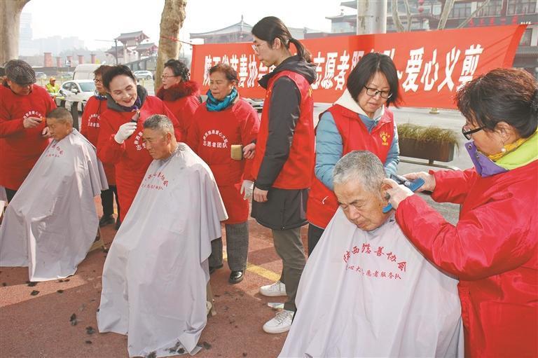 春節(jié)前,陜西省慈善協(xié)會愛心大姐志愿者服務(wù)隊組織開展上門義剪服務(wù)。圖為2月1日,愛心志愿者在西安大雁塔北廣場為小寨東路環(huán)衛(wèi)站全體環(huán)衛(wèi)工人義務(wù)理發(fā)。吳寬宏 攝