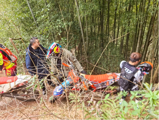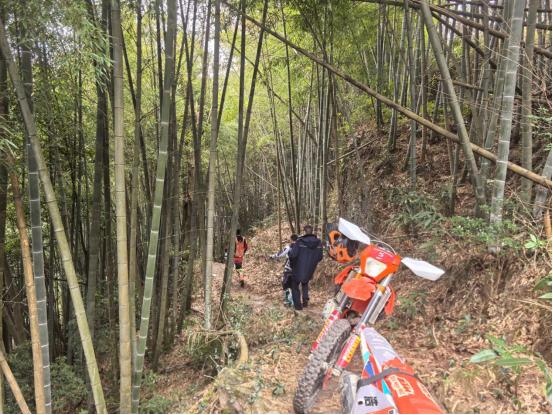 騎友們急在心頭,嘗試推車、墊土等方法脫困均無果。深山古道偏僻,無行人可求助,大家一時束手無策。就在一籌莫展之際,正在周邊開展常態(tài)化安全隱患排查的溪口鎮(zhèn)綜合行政執(zhí)法隊隊員恰好經(jīng)過。看到被困情況,隊員們立即停車上前,詢問情況、查看路況,迅速投入救援。