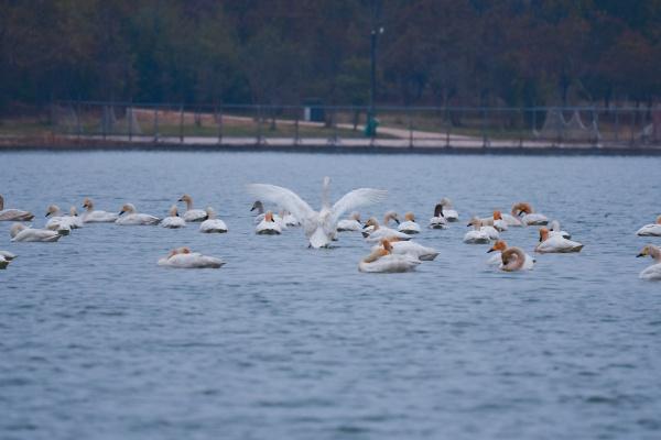 天鵝的持續(xù)到訪,已成為當?shù)厝罕娮钇诖摹澳甓戎s”?!?021年之前也曾見過天鵝,但多為三兩只,當時誤以為是家養(yǎng)禽類?!背砉珗@鍛煉的市民張先生感慨。家住公園附近的盧先生補充說:“此次天鵝凌晨5點多飛抵,老伴兒聽到天鵝的叫聲,便知道它們來了,我們期盼已久?!睋?jù)了解,除白天鵝外,赤麻鴨、綠頭鴨、鳳頭??等國家二級保護動物也常在此棲息,成為當?shù)厣锒鄻有员Wo的生動寫照。
