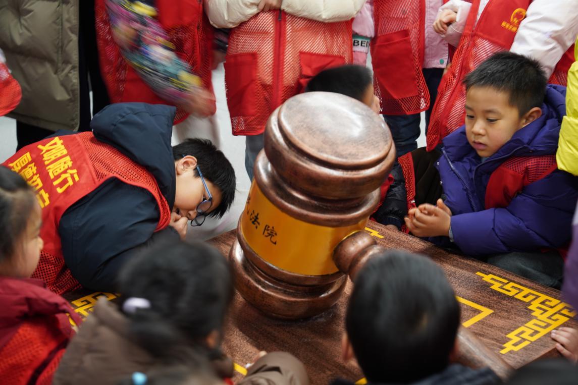 春風(fēng)潤(rùn)心田,學(xué)法正當(dāng)時(shí)。近日,浙江省寧波市鎮(zhèn)海區(qū)人民法院聯(lián)合屬地街道、人大代表,在該院法院文化館組織開展青少年法治研學(xué)活動(dòng),通過(guò)沉浸式普法教育,引導(dǎo)青少年增強(qiáng)法治觀念,助力法治素養(yǎng)提升。圖為學(xué)生圍繞仿制法槌開展互動(dòng)體驗(yàn)。(徐益麗)