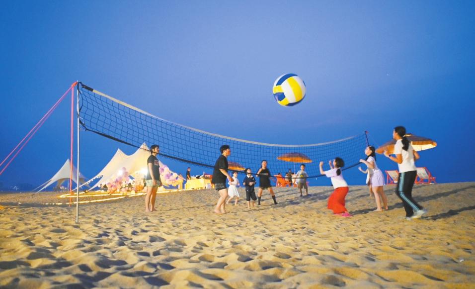 家長帶著孩子們在??跇s山寮村的沙灘上打排球。記者 石中華 攝