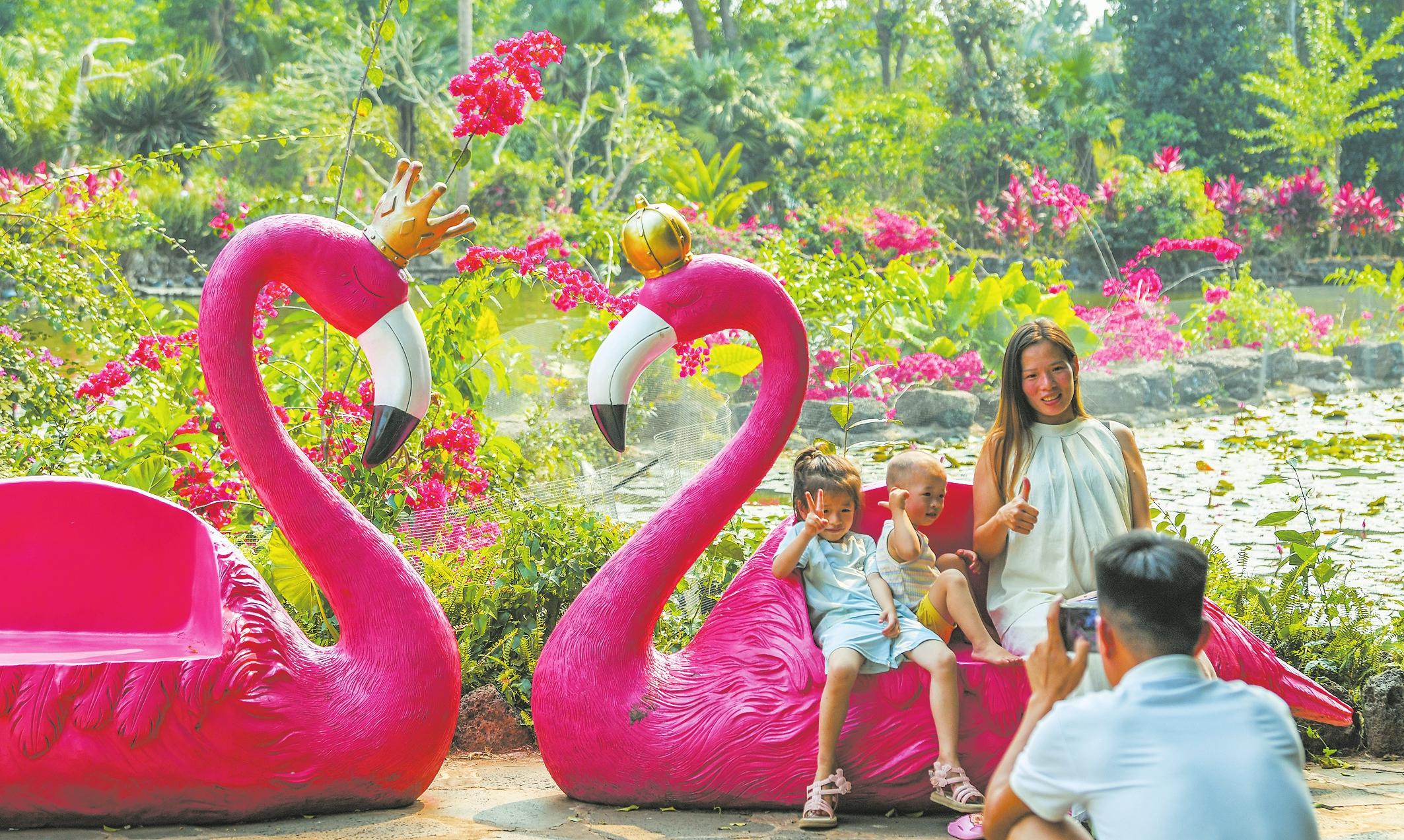 親子家庭在海南熱帶野生動植物園內打卡拍照。記者 康登淋 攝
