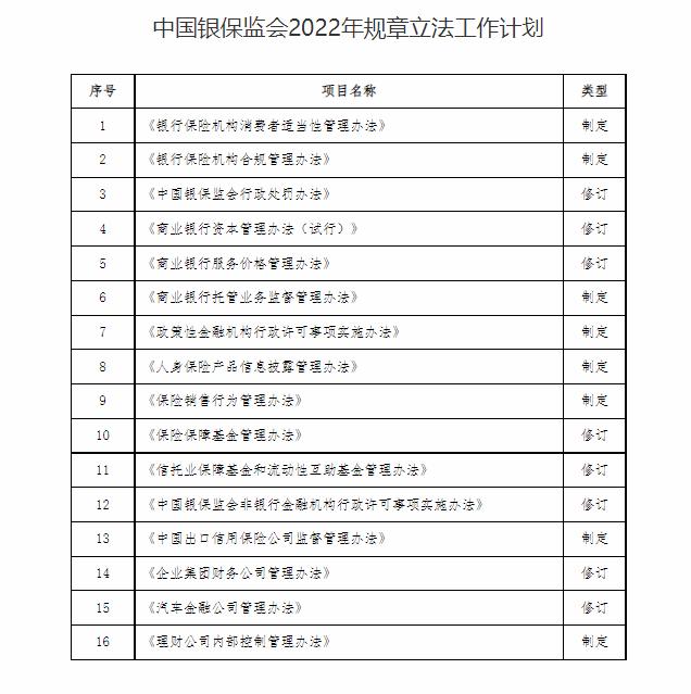 日前,銀保監(jiān)會公布2022年規(guī)章立法工作計劃。計劃包括16項內容,其中修訂計劃8項,制定計劃8項。