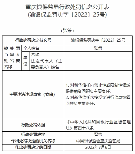 張策對(duì)新華信托向禁止性或限制性領(lǐng)域提供融資問題負(fù)主要責(zé)任、對(duì)新華信托未按規(guī)定進(jìn)行信息披露問題負(fù)主要責(zé)任。依據(jù)《中華人民共和國(guó)銀行業(yè)監(jiān)督管理法》第四十八條,中國(guó)銀保監(jiān)會(huì)重慶監(jiān)管局對(duì)其警告。