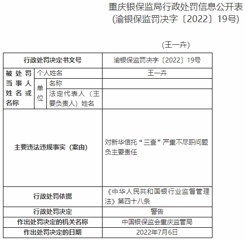 王一卉對(duì)新華信托“三查”嚴(yán)重不盡職問題負(fù)主要責(zé)任。依據(jù)《中華人民共和國(guó)銀行業(yè)監(jiān)督管理法》第四十八條,中國(guó)銀保監(jiān)會(huì)重慶監(jiān)管局對(duì)其警告。