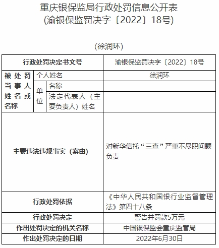 徐潤(rùn)環(huán)對(duì)新華信托“三查”嚴(yán)重不盡職問題負(fù)責(zé)。依據(jù)《中華人民共和國(guó)銀行業(yè)監(jiān)督管理法》第四十八條,中國(guó)銀保監(jiān)會(huì)重慶監(jiān)管局對(duì)其警告并罰款5萬(wàn)元。