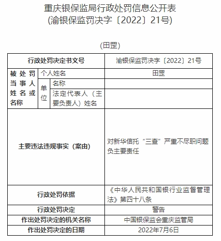 田罡對(duì)新華信托“三查”嚴(yán)重不盡職問題負(fù)主要責(zé)任。依據(jù)《中華人民共和國(guó)銀行業(yè)監(jiān)督管理法》第四十八條,中國(guó)銀保監(jiān)會(huì)重慶監(jiān)管局對(duì)其警告。