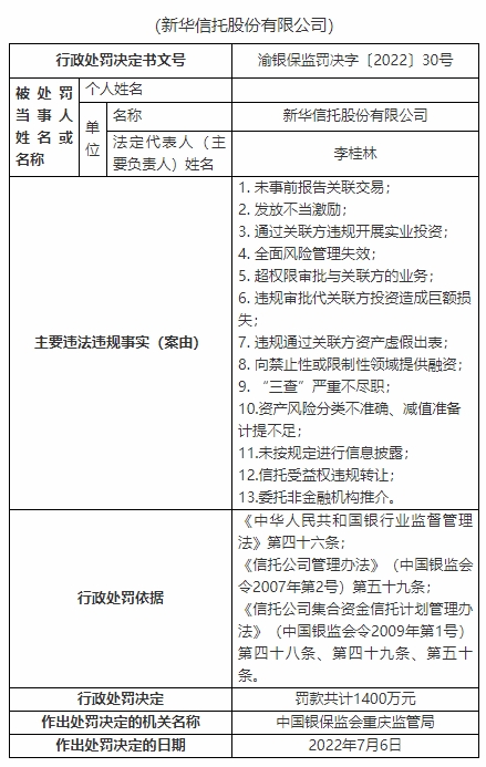銀保監(jiān)會(huì)網(wǎng)站今日公布了重慶銀保監(jiān)局行政處罰信息公開表(渝銀保監(jiān)罰決字〔2022〕30號(hào)、16號(hào)、18號(hào)、19號(hào)、20號(hào)、21號(hào)、22號(hào)、23號(hào)、24號(hào)、25號(hào)、26號(hào)、27號(hào)、28號(hào)、29號(hào)、31號(hào)、32號(hào))顯示,新華信托股份有限公司存在13宗主要違法違規(guī)事實(shí):未事前報(bào)告關(guān)聯(lián)交易;發(fā)放不當(dāng)激勵(lì);通過關(guān)聯(lián)方違規(guī)開展實(shí)業(yè)投資;全面風(fēng)險(xiǎn)管理失效;超權(quán)限審批與關(guān)聯(lián)方的業(yè)務(wù);違規(guī)審批代關(guān)聯(lián)方投資造成巨額損失;違規(guī)通過關(guān)聯(lián)方資產(chǎn)虛假出表;向禁止性或限制性領(lǐng)域提供融資;“三查”嚴(yán)重不盡職;資產(chǎn)風(fēng)險(xiǎn)分類不準(zhǔn)確、減值準(zhǔn)備計(jì)提不足;未按規(guī)定進(jìn)行信息披露;信托受益權(quán)違規(guī)轉(zhuǎn)讓;委托非金融機(jī)構(gòu)推介。