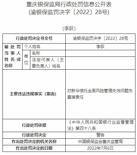 李荻對(duì)新華信托全面風(fēng)險(xiǎn)管理失效問題負(fù)直接責(zé)任。依據(jù)《中華人民共和國(guó)銀行業(yè)監(jiān)督管理法》第四十八條,中國(guó)銀保監(jiān)會(huì)重慶監(jiān)管局對(duì)其警告。