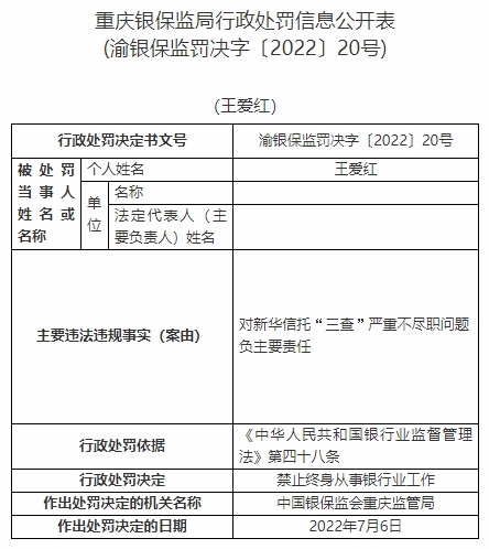 王愛紅對(duì)新華信托“三查”嚴(yán)重不盡職問題負(fù)主要責(zé)任。依據(jù)《中華人民共和國(guó)銀行業(yè)監(jiān)督管理法》第四十八條,中國(guó)銀保監(jiān)會(huì)重慶監(jiān)管局對(duì)其禁止終身從事銀行業(yè)工作。
