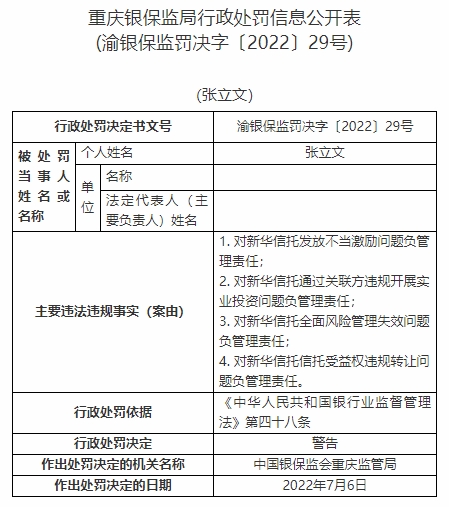 張立文對(duì)新華信托發(fā)放不當(dāng)激勵(lì)問題負(fù)管理責(zé)任、對(duì)新華信托通過關(guān)聯(lián)方違規(guī)開展實(shí)業(yè)投資問題負(fù)管理責(zé)任、對(duì)新華信托全面風(fēng)險(xiǎn)管理失效問題負(fù)管理責(zé)任、對(duì)新華信托信托受益權(quán)違規(guī)轉(zhuǎn)讓問題負(fù)管理責(zé)任。依據(jù)《中華人民共和國(guó)銀行業(yè)監(jiān)督管理法》第四十八條,中國(guó)銀保監(jiān)會(huì)重慶監(jiān)管局對(duì)其警告。