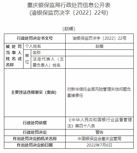 趙暖對(duì)新華信托全面風(fēng)險(xiǎn)管理失效問題負(fù)直接責(zé)任。依據(jù)《中華人民共和國(guó)銀行業(yè)監(jiān)督管理法》第四十八條,中國(guó)銀保監(jiān)會(huì)重慶監(jiān)管局對(duì)其警告。