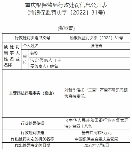 張繼青對(duì)新華信托“三查”嚴(yán)重不盡職問題負(fù)直接責(zé)任。依據(jù)《中華人民共和國(guó)銀行業(yè)監(jiān)督管理法》第四十八條,中國(guó)銀保監(jiān)會(huì)重慶監(jiān)管局對(duì)其警告并罰款5萬(wàn)元。