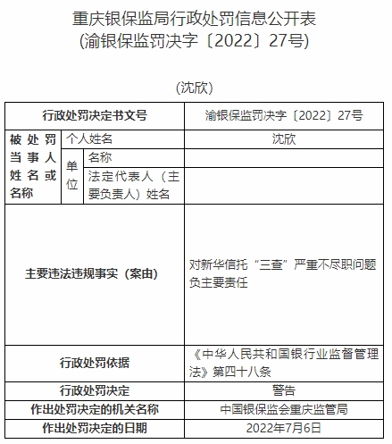 沈欣對(duì)新華信托“三查”嚴(yán)重不盡職問題負(fù)主要責(zé)任。依據(jù)《中華人民共和國(guó)銀行業(yè)監(jiān)督管理法》第四十八條,中國(guó)銀保監(jiān)會(huì)重慶監(jiān)管局對(duì)其警告。