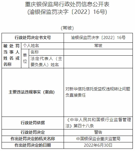 常坡對(duì)新華信托信托受益權(quán)違規(guī)轉(zhuǎn)讓問題負(fù)直接責(zé)任。依據(jù)《中華人民共和國(guó)銀行業(yè)監(jiān)督管理法》第四十八條,中國(guó)銀保監(jiān)會(huì)重慶監(jiān)管局對(duì)其警告。