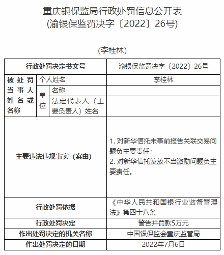 李桂林對(duì)新華信托未事前報(bào)告關(guān)聯(lián)交易問題負(fù)主要責(zé)任、對(duì)新華信托發(fā)放不當(dāng)激勵(lì)問題負(fù)主要責(zé)任。依據(jù)《中華人民共和國(guó)銀行業(yè)監(jiān)督管理法》第四十八條,中國(guó)銀保監(jiān)會(huì)重慶監(jiān)管局對(duì)其警告并罰款5萬(wàn)元。
