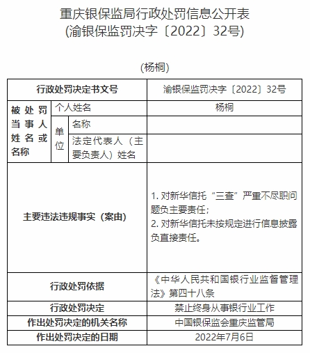 楊桐對(duì)新華信托“三查”嚴(yán)重不盡職問題負(fù)主要責(zé)任、對(duì)新華信托未按規(guī)定進(jìn)行信息披露負(fù)直接責(zé)任。依據(jù)《中華人民共和國(guó)銀行業(yè)監(jiān)督管理法》第四十八條,中國(guó)銀保監(jiān)會(huì)重慶監(jiān)管局對(duì)其禁止終身從事銀行業(yè)工作。