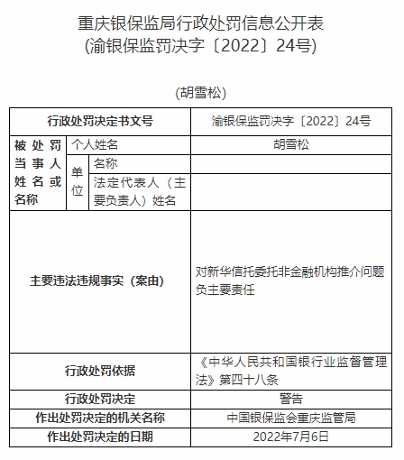 胡雪松對(duì)新華信托委托非金融機(jī)構(gòu)推介問題負(fù)主要責(zé)任。依據(jù)《中華人民共和國(guó)銀行業(yè)監(jiān)督管理法》第四十八條,中國(guó)銀保監(jiān)會(huì)重慶監(jiān)管局對(duì)其警告。