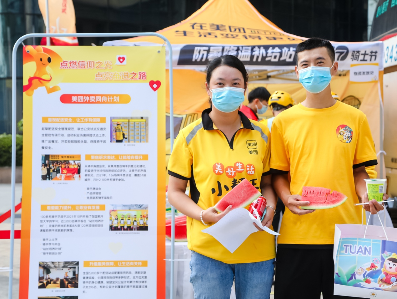 今年7月17日是第五個(gè)“717騎士節(jié)”,為向廣大騎手傳遞節(jié)日關(guān)懷、加強(qiáng)騎手勞動(dòng)安全保障,美團(tuán)配送在全國(guó)超過100個(gè)城市增設(shè)防暑驛站,為騎手提供休息場(chǎng)所和消暑補(bǔ)給,并向騎手發(fā)放防曬用品和夏季常用藥品等防暑物資。在深圳、杭州、成都等7個(gè)城市,美團(tuán)配送的騎手健康體檢車也開上街頭,為騎手提供“隨到隨檢”的便捷服務(wù)。
