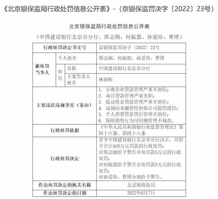 近日,中國銀行保險監(jiān)督管理委員會網(wǎng)站顯示,中國建設(shè)銀行北京分行因小微企業(yè)貸款管理嚴(yán)重不到位、項目貸款管理嚴(yán)重失職、流動資金貸款管理嚴(yán)重不到位、違規(guī)向非融資性擔(dān)保公司提供授信、個人消費貸款貸后管理不到位、保險銷售行為可回溯管理不規(guī)范等,被北京銀保監(jiān)局責(zé)令改正,并罰款410萬元,給予邢志剛警告并處罰款5萬元、給予何振盟警告并處罰款5萬元的行政處罰,并對孫愛珍、曹博給予?警告。