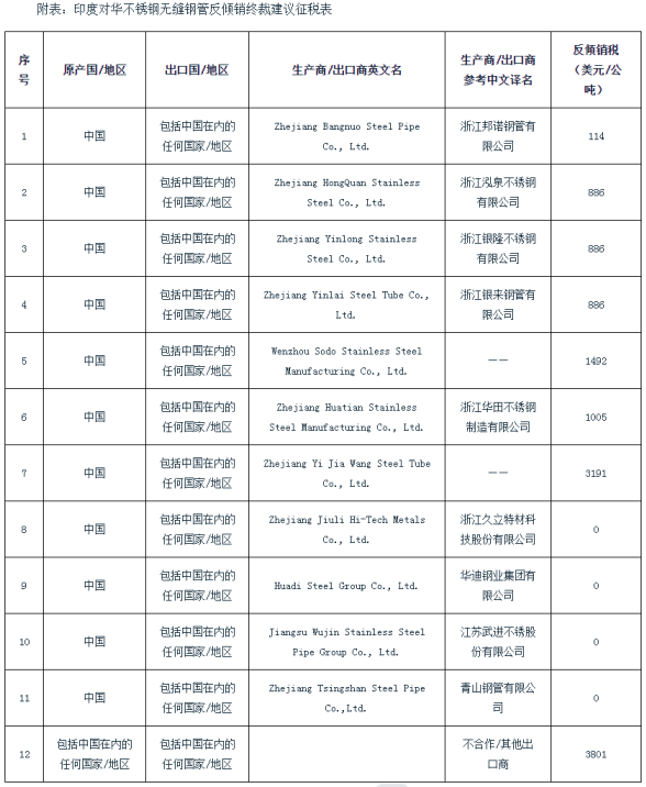 2022年9月23日,印度商工部發(fā)布公告,對(duì)原產(chǎn)于或進(jìn)口自中國(guó)的直徑小于等于6英寸的不銹鋼無縫鋼管(Stainless-steel Seamless Tubes & Pipes)作出反傾銷終裁,建議對(duì)中國(guó)的涉案產(chǎn)品征收為期5年的反傾銷稅,稅額為0~3801美元/公噸,征稅詳情見附表(印度對(duì)華不銹鋼無縫鋼管反傾銷終裁建議征稅表)。涉案產(chǎn)品為無論是采用熱擠壓工藝或熱穿孔工藝制造,無論是作為熱加工管或冷加工管售賣,包括缺陷品、非打印品或二級(jí)品在內(nèi)的、公稱直徑不超過6英寸或與其相當(dāng)?shù)钠渌?jì)量單位的不銹鋼無縫鋼管,涉及印度海關(guān)編碼7304項(xiàng)下的產(chǎn)品。