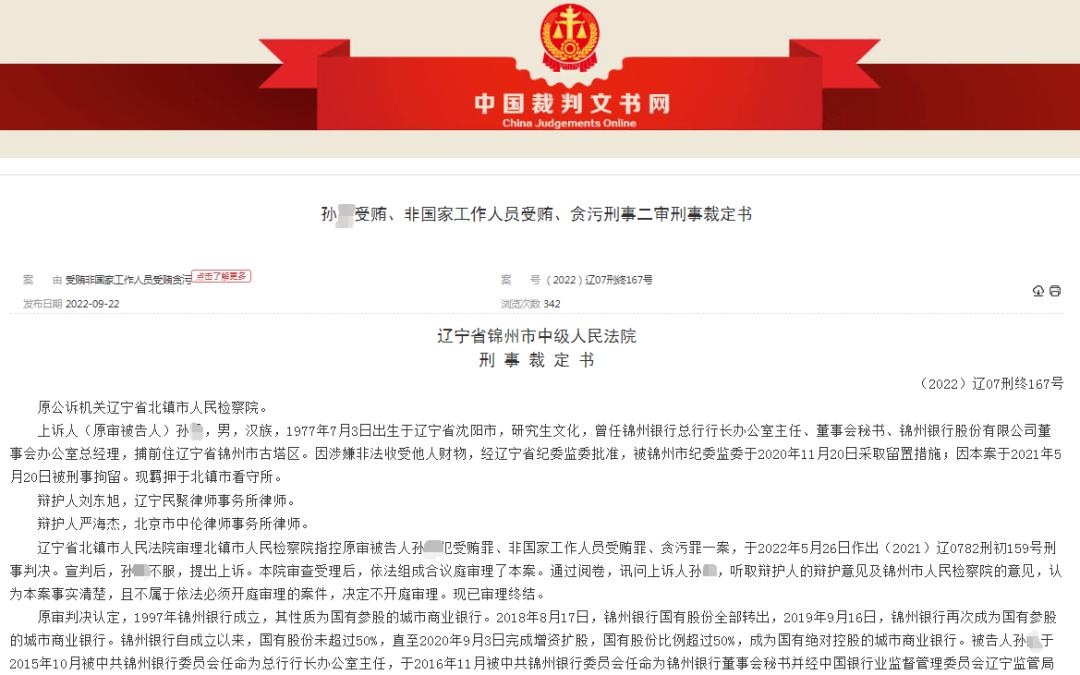 日前,中國(guó)裁判文書(shū)網(wǎng)發(fā)布一份刑事裁定書(shū),披露了錦州銀行(00416.HK)原董事會(huì)秘書(shū)孫某受賄、非國(guó)家工作人員受賄、貪污一案的具體情況。
