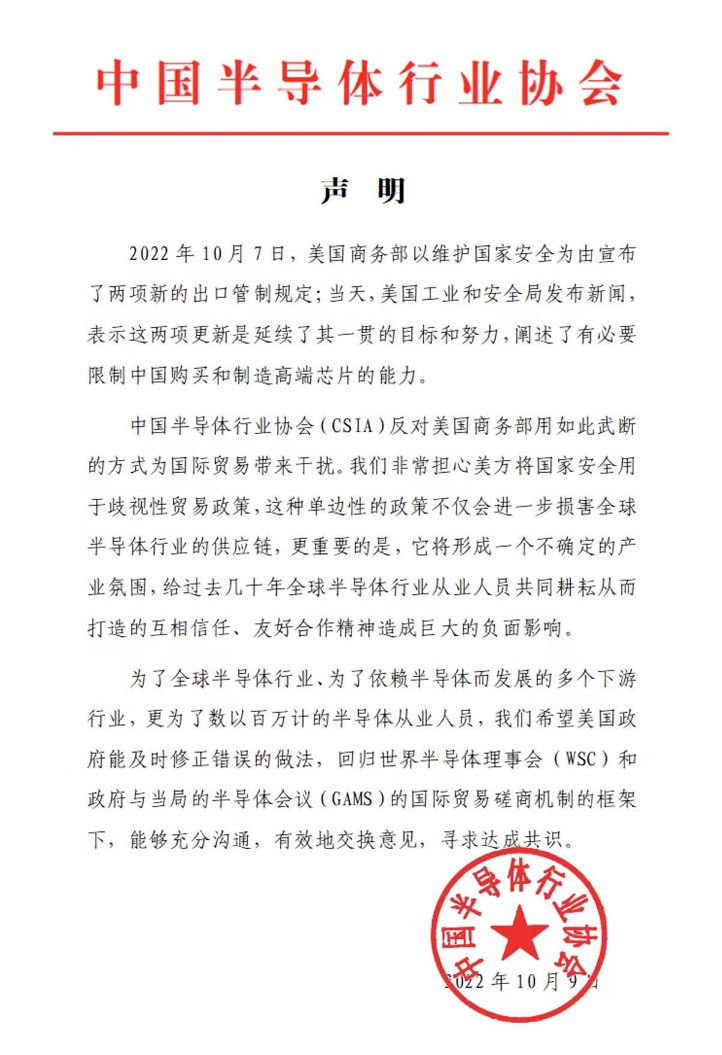 在聲明中,中國半導體行業(yè)協(xié)會指出,10月7日,美國工業(yè)和安全局發(fā)布新聞,表示這兩項出口管制規(guī)定更新是延續(xù)了其一貫的目標和努力,闡述了有必要限制中國購買和制造高端芯片的能力。
