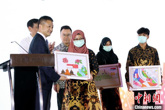 圖為受過中企捐贈的印尼民眾向陸慷大使贈送畫作表達(dá)對兩國關(guān)系的祝福