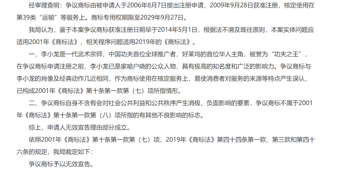 國家知識產(chǎn)權(quán)局審理認為,李小龍是一代武術(shù)宗師,中國功夫首位全球推廣者,好萊塢的首位華人主角,被譽為“功夫之王”,在爭議商標申請注冊之前,李小龍已是家喻戶曉的公眾人物,具有極高的知名度和廣泛的影響力。爭議商標與李小龍的肖像及經(jīng)典動作幾近相同,作為商標使用在核定服務(wù)上,易使消費者對服務(wù)的來源等特點產(chǎn)生誤認,已構(gòu)成2001年《商標法》第十條第一款第(七)項所指情形(即夸大宣傳并帶有欺騙性的標志不得作為商標使用)。