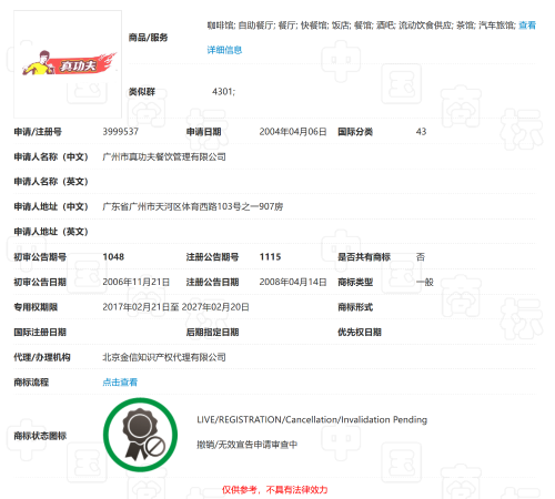 以“真功夫及圖”(注冊號:3999537)為例,中國商標網(wǎng)顯示,該商標為真功夫于2004年申請注冊的第43類“餐廳”等服務(wù)商標,專用權(quán)期限原為2017年2月21日至2027年2月20日。
