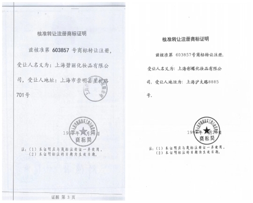 然而,詩妍公司向國家知識產(chǎn)權(quán)局調(diào)取原始檔案發(fā)現(xiàn),在碧麗公司受讓該商標(biāo)之前,該商標(biāo)是由上海彩蝶化妝品有限公司受讓取得,兩家公司地址不一樣。但受讓時間又是一致的?!帮@然,碧麗公司提供給法院的證據(jù)為假。申請人存在向法院提交虛假變造證據(jù)的不誠信行為?!壁w智慶說。