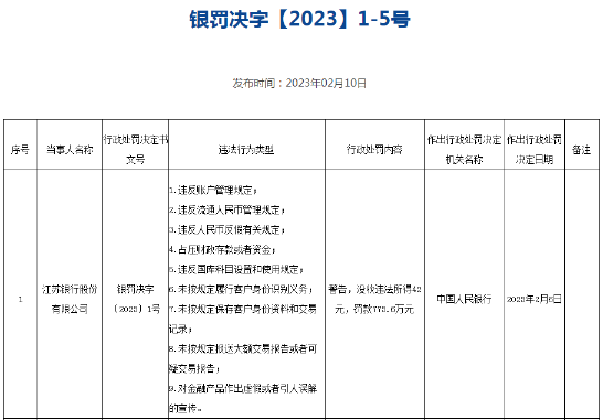 針對(duì)上述違法行為,中國(guó)人民銀行對(duì)江蘇銀行處以警告,沒收違法所得42元,并罰款773.6萬元。行政處罰決定日期為2023年2月6日。