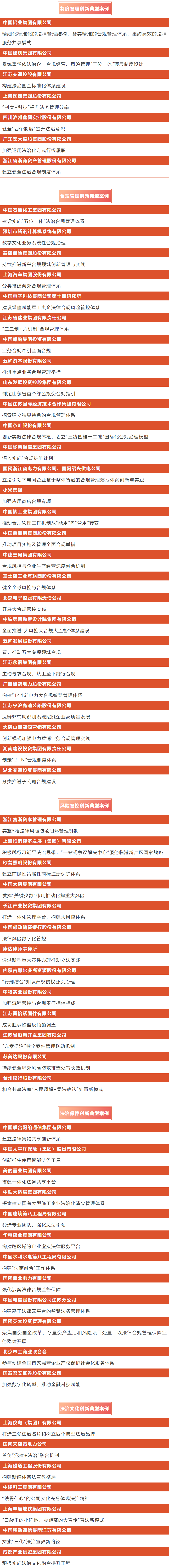 經過一個多月的征集、篩選和專家評議,最終從353個案例中產生“制度管理創(chuàng)新典型案例”“合規(guī)管理創(chuàng)新典型案例”“風險管控創(chuàng)新典型案例”“法治保障創(chuàng)新典型案例”“法治文化創(chuàng)新典型案例”5個類別共66個典型案例。結果如下(排名不分先后):