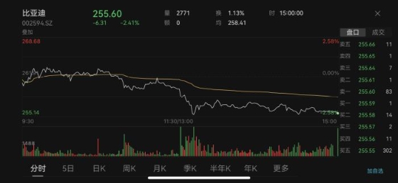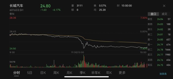 25日盤中,長城汽車一度跌超7%,比亞迪跌超2%。截至收盤,長城汽車股價報(bào)24.80元,下跌6.17%。比亞迪股價報(bào)255.60元,下跌2.41%。汽車整車板塊則下跌0.85%。有股民留言,“最慘的是同時擁有重倉長城汽車和比亞迪的股民,例如我,太慘了。”
