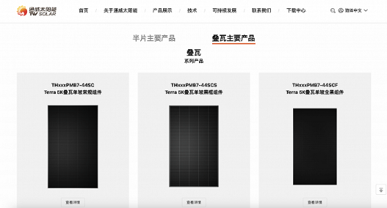界面新聞注意到,通威太陽能官網(wǎng)顯示了七款疊瓦主要產(chǎn)品。在去年年報中,通威股份在組件部分提到,海外市場重點聚焦歐洲、亞太、南美等終端市場,利用各版型疊瓦、半片產(chǎn)品“矩陣”,滿足海外客戶對高效組件的差異化需求。