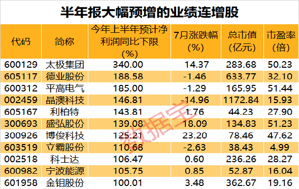 行情上來看,業(yè)績預計連增股本月以下跌為主,平均下跌1.23%,萬澤股份、晶澳科技、康緣藥業(yè)、太極集團7月以來跌幅均超過14%。
