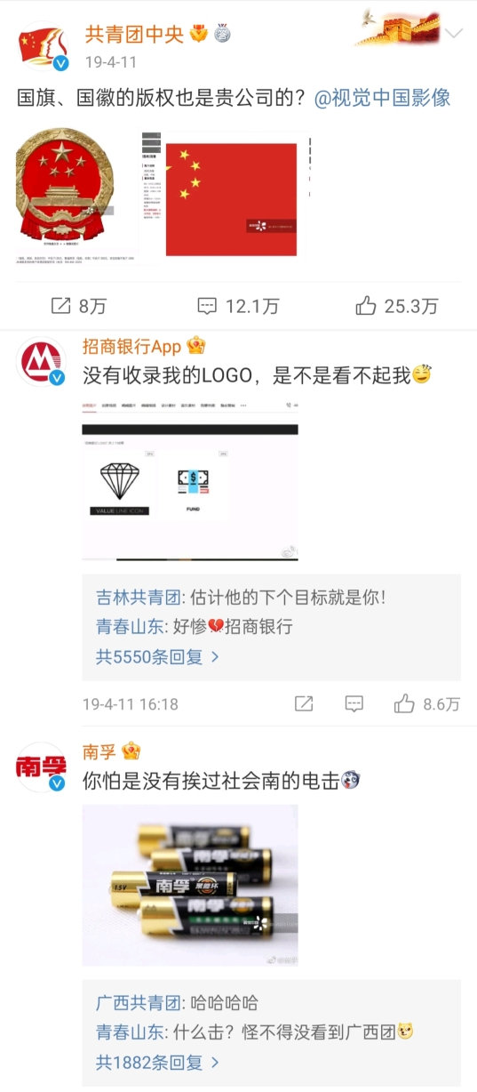 2019年4月11日,“共青團中央”官微點名視覺中國并質(zhì)疑:“國旗、國徽的版權(quán)也是貴公司的?”隨后,一眾藍V排隊評論自家LOGO也被視覺中國收入囊中,甚至連歷史書上的人物圖也被視覺中國明碼標價,成為其牟利之物。