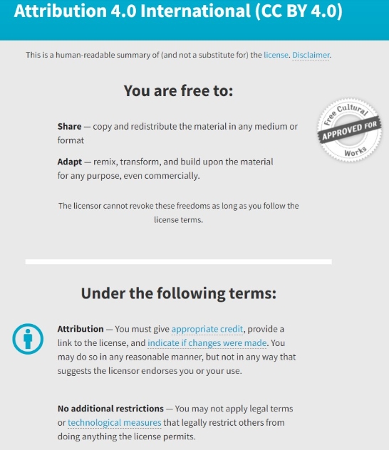 知識共享署名4.0國際許可協(xié)議,允許使用者用于商業(yè)用途,但不得應用法律條款或技術措施來合法限制他人執(zhí)行許可證允許的任何操作。 截圖自CC官網(wǎng)。