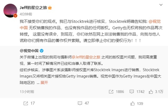 “我不接受你們的觀點。我已與Stocktrek進行核實,Stocktrek明確告知我: @視覺中國 無權(quán)銷售我的作品,也沒有我作品的任何版權(quán)。Getty也無權(quán)將我的作品再次轉(zhuǎn)授。這里沒有誤會,到現(xiàn)在,你們依然在網(wǎng)上非法銷售我的作品,向我與他人謊稱你們擁有作品的著作權(quán)并索賠。請立即停止你們的侵權(quán)行為!”
