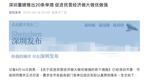 近期,各地促進(jìn)民營(yíng)經(jīng)濟(jì)發(fā)展的政策舉措密集出臺(tái),深圳也密集推出系列政策舉措。8月7日,深圳三大優(yōu)化營(yíng)商環(huán)境工作方案正式發(fā)布,立足于市場(chǎng)化、法治化、國(guó)際化加快營(yíng)造一流營(yíng)商環(huán)境。據(jù)深圳發(fā)布16日消息,《關(guān)于促進(jìn)民營(yíng)經(jīng)濟(jì)做大做優(yōu)做強(qiáng)的若干措施》(下稱(chēng)《若干措施》)已經(jīng)深圳市委、市政府同意并正式印發(fā),提出20項(xiàng)舉措,加速釋放民營(yíng)企業(yè)發(fā)展動(dòng)能。