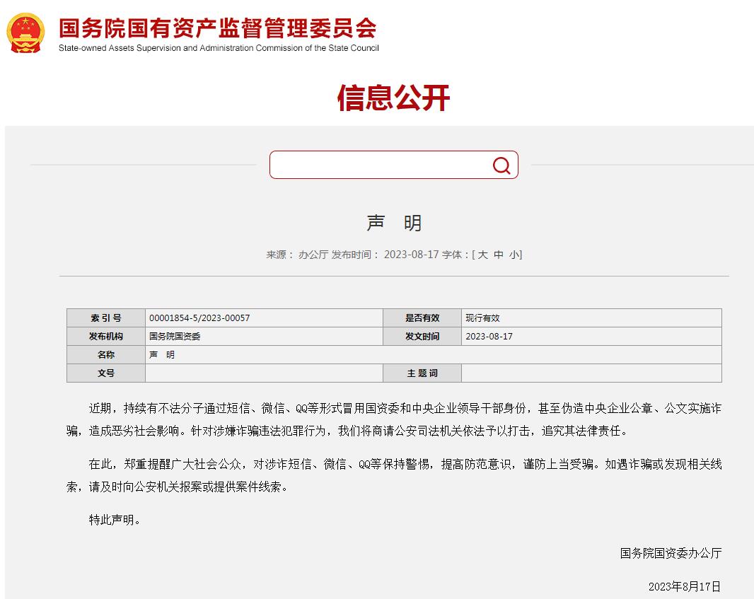 國務院國有資產(chǎn)監(jiān)督管理委員會網(wǎng)站8月17日發(fā)布聲明稱,近期,持續(xù)有不法分子通過短信、微信、QQ等形式冒用國資委和中央企業(yè)領導干部身份,甚至偽造中央企業(yè)公章、公文實施詐騙,造成惡劣社會影響。針對涉嫌詐騙違法犯罪行為,國務院國資委將商請公安司法機關(guān)依法予以打擊,追究其法律責任。