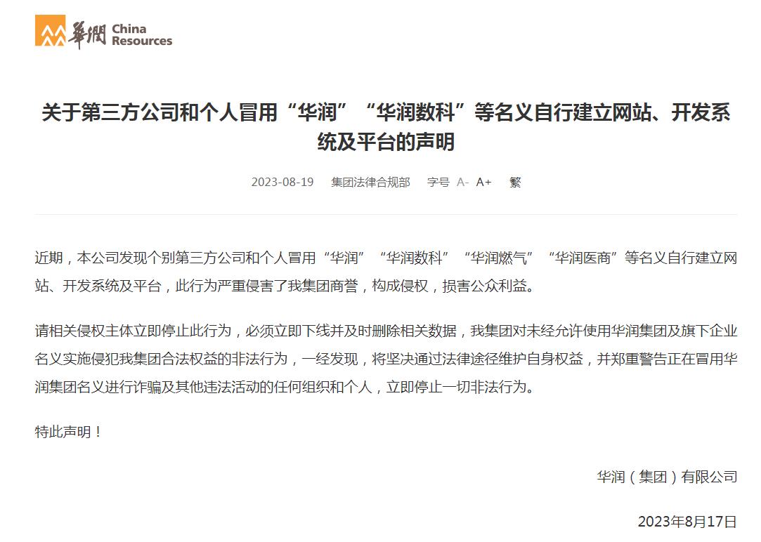 華潤(集團)有限公司(以下簡稱“華潤集團”)的聲明稱,近期,公司發(fā)現(xiàn)個別第三方公司和個人冒用“華潤”“華潤數(shù)科”“華潤燃氣”“華潤醫(yī)商”等名義自行建立網(wǎng)站、開發(fā)系統(tǒng)及平臺,此行為嚴重侵害了華潤集團商譽,構(gòu)成侵權(quán),損害公眾利益。