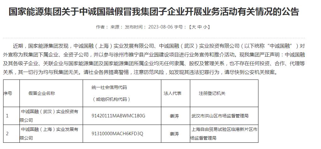 8月6日,國家能源集團發(fā)布了關(guān)于中誠國融假冒集團子企業(yè)開展業(yè)務活動有關(guān)情況的公告。