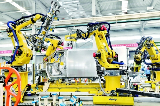 在山東鄒平魏橋輕量化基地宏奧全鋁車身集成生產(chǎn)車間,工業(yè)機(jī)器人在流水線上作業(yè) 新華社 圖